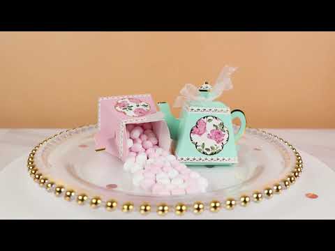 Feminine and elegant, these tea time whimsy teapot favor boxes are sure to be just the accent you need at your afternoon tea party! These aqua teapot-shaped cardstock favor box with 3-D spout and handle are gorgeous. It features a delicate floral design in the center of the teapot, gold foil details, and a white organza ribbon.